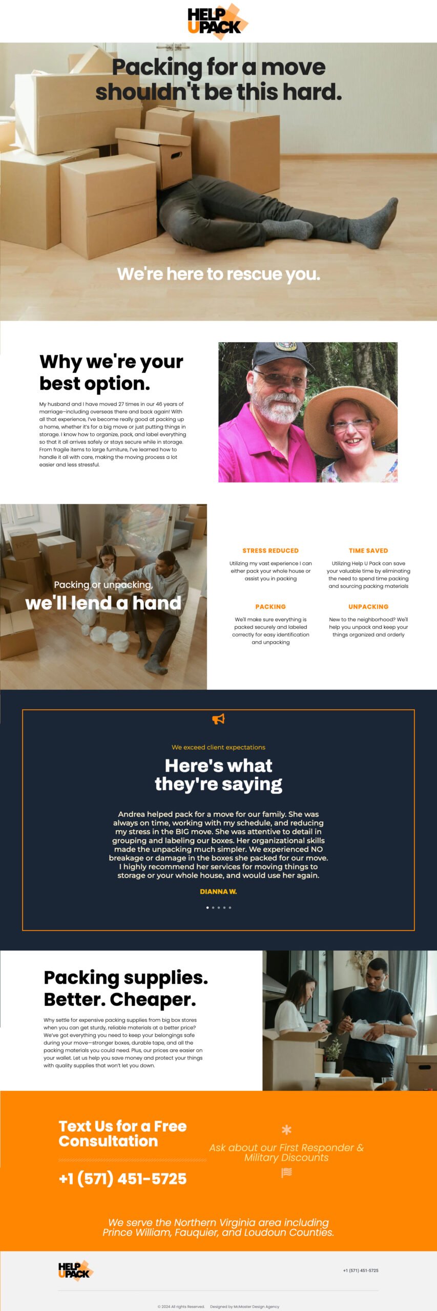 The website centers on empathy and approachability, featuring a hero image of a person overwhelmed by boxes to reflect the stress most people experience during a move. Supporting imagery transitions into lighter, more optimistic scenes, reinforcing HelpUPack’s promise to make packing smoother, calmer, and even enjoyable.